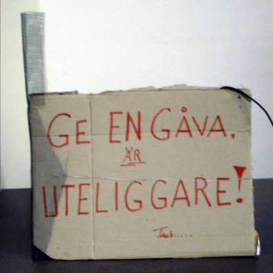 This installation asks a similar question about the relationships within the art world. Is the artist's work valid? Is the gallerist displaying work of sincerity and value? The homeless signs had to be purchased with the reverse drawings and interventions unseen until the show was uninstalled.